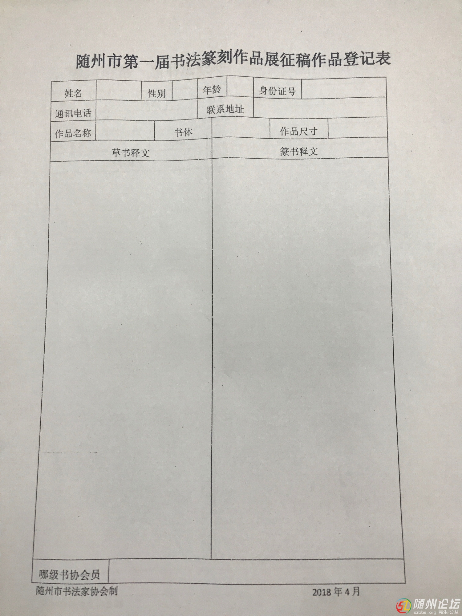 “隨州市書法家協(xié)會統(tǒng)一制發(fā)的登記表(表樣公布、自行復(fù)制)”,這個表格在哪領(lǐng)取或者下載? |