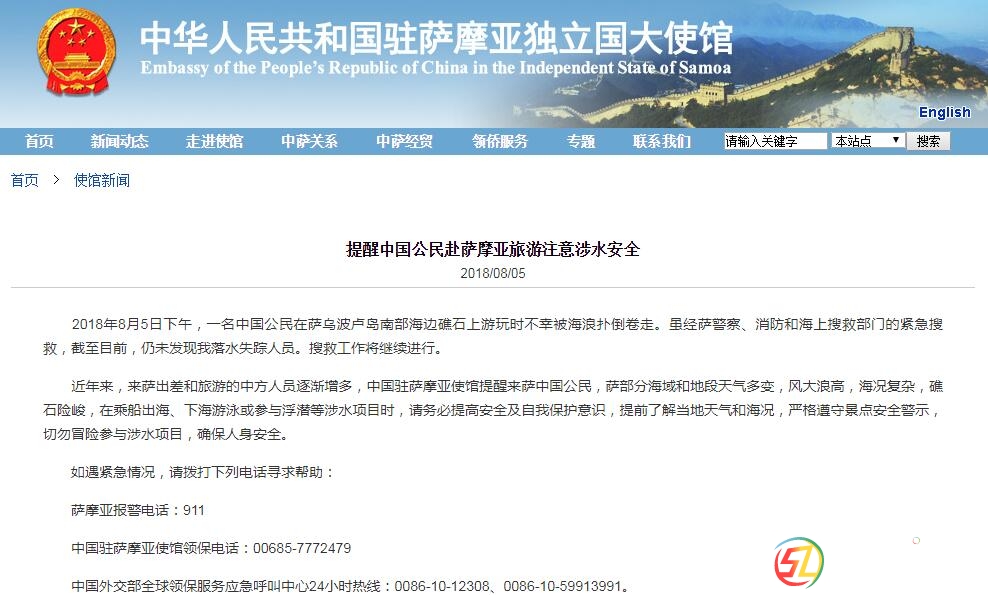 據(jù)中國駐薩摩亞大使館網(wǎng)站消息,當?shù)貢r間2018年8月5日下午,一名中國公民在薩烏波盧島南部海邊礁石上游玩時不幸被海浪撲倒卷走。雖經(jīng)薩警察、消防和海上搜救部門的緊急搜救,截至目前,仍未發(fā)現(xiàn)落水失蹤人員。搜救工 ...
