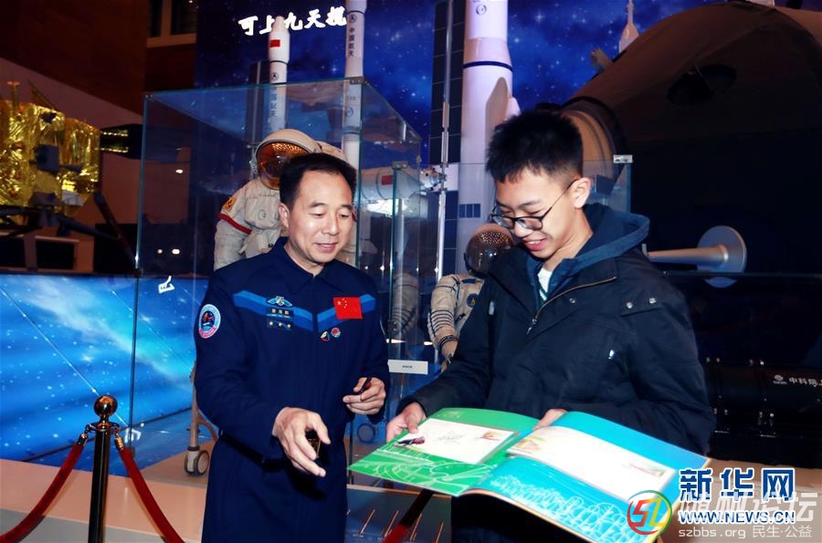 1月29日,“時代楷?!薄教靻T群體代表景海鵬(左)向第300萬位現(xiàn)場觀眾——來自北京航空航天大學(xué)實(shí)驗(yàn)學(xué)校初二年級的陳浩天同學(xué)簽名贈送改革開放40周年紀(jì)念郵票。 新華社記者 潘旭 攝 新華社北京1月29日 ...
