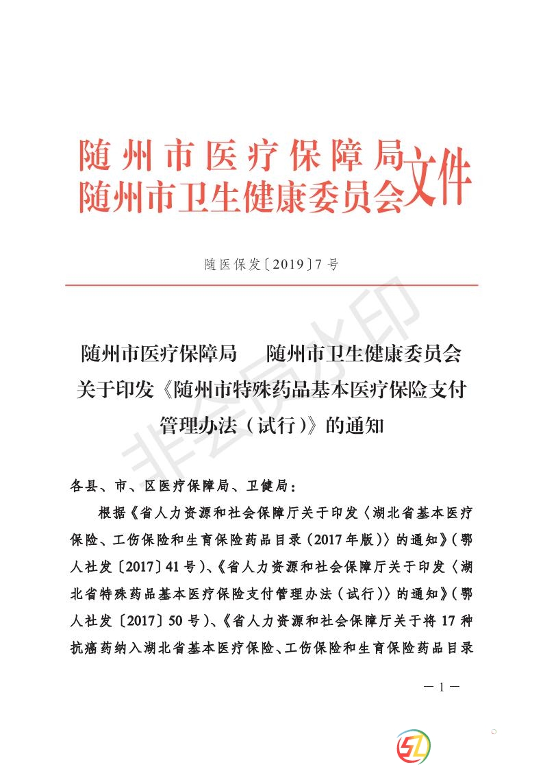 隨州市醫(yī)保局、衛(wèi)健委關于特殊藥品基本醫(yī)療保險支付管理辦法的通知
