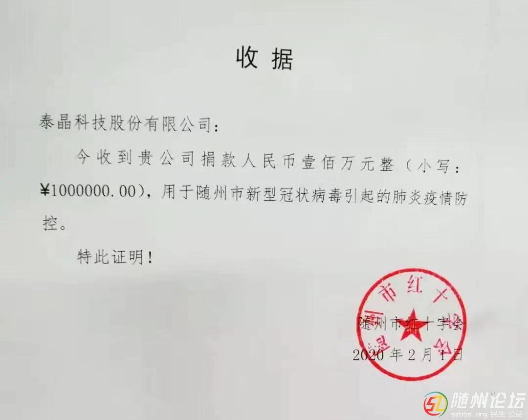 本帖最后由 隨州日報 于 2020-2-1 21:52 編輯 泰晶科技捐贈100萬元抗擊疫情 緊急組織疫情防控物資生產(chǎn) 隨州日報訊(全媒記者張琴)2月1日,泰晶科技向隨州市紅十字會捐款100萬元,用于新型肺炎疫情 ...