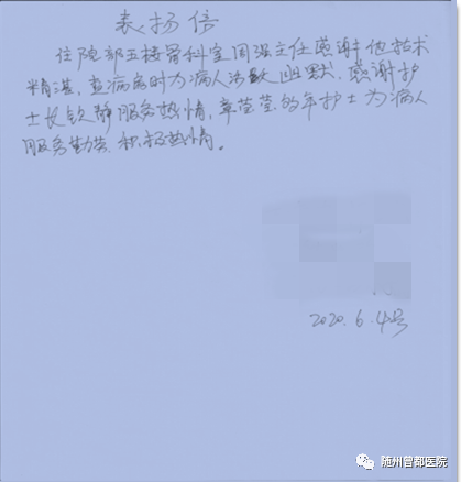 患者表揚信 字字真情暖人心“欽護士長、章護士,我媽今天要出院回家了?!?月4日上午,曾都醫(yī)院外一科患者謝某珍的女兒呂某娟將一封表揚信交到護士站護士手中。 “老人年紀大了,一直和我們說你們外一科的醫(yī)務人員的 ...