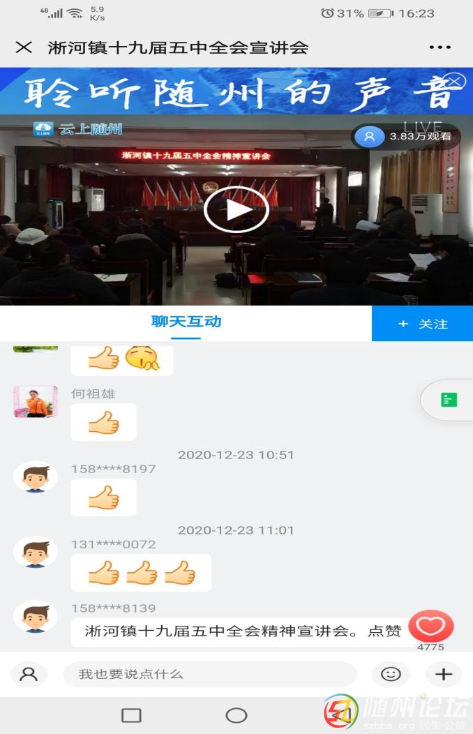 本帖最后由 自由如風(fēng) 于 2020-12-24 21:30 編輯 12月23日,淅河鎮(zhèn)召開黨的十九屆五中全會精神宣講會。鎮(zhèn)黨委委員、副鎮(zhèn)長楊璇主持宣講會,鎮(zhèn)黨委書記李福銀作宣講報告。 主講環(huán)節(jié)結(jié)束 ...