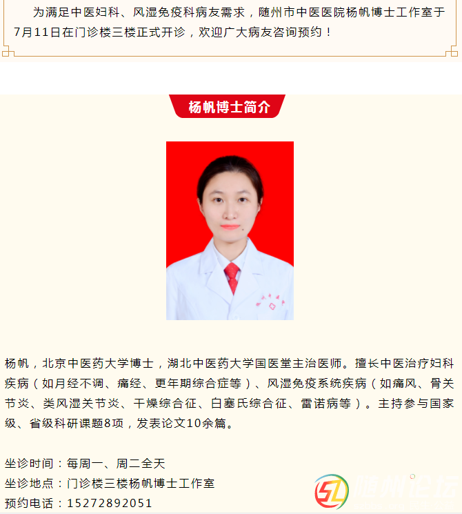 隨州市中醫(yī)醫(yī)院“楊帆博士工作室”開診時間通知