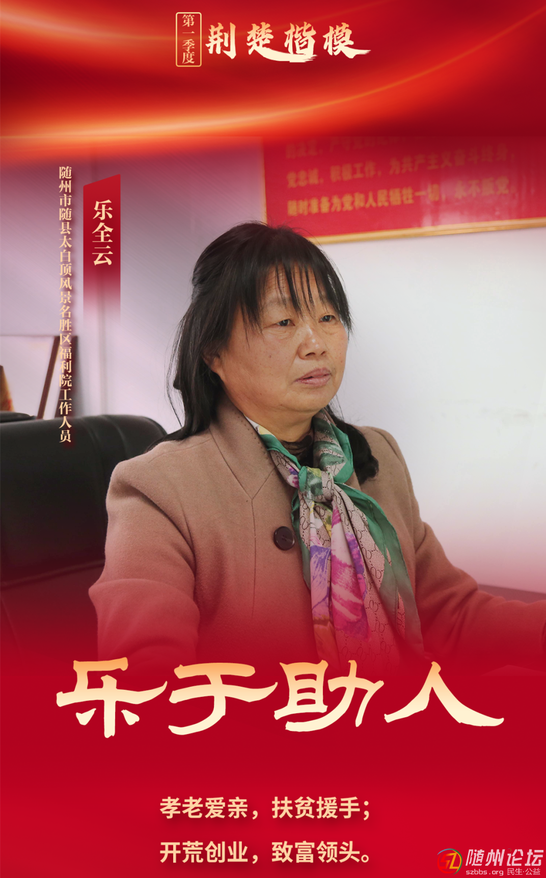 本帖最后由 隨州日報(bào) 于 2024-4-3 09:32 編輯 隨州日報(bào)訊(通訊員黃杰)近日,“荊楚楷?!?024年第一季度上榜人物名單揭曉,隨縣太白頂風(fēng)景名勝區(qū)福利院工作人員樂全云上榜。 樂全云,女,以前在太白 ...